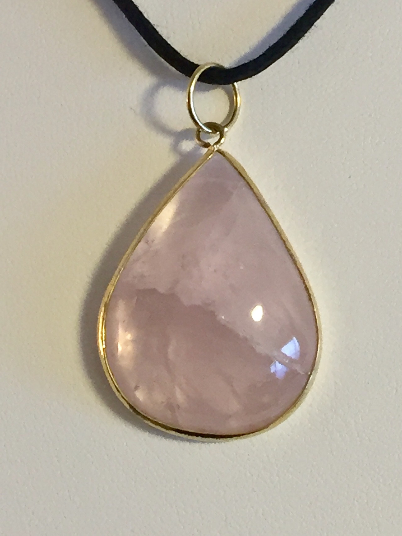 この雫型のローズクォーツは、透明感が素晴らしくツヤに溢れています。さざ波の様に入っている模様は、違う角度から見ると光を集めキラキラと反射し、まるで石の中にまた違った世界があるようです。
